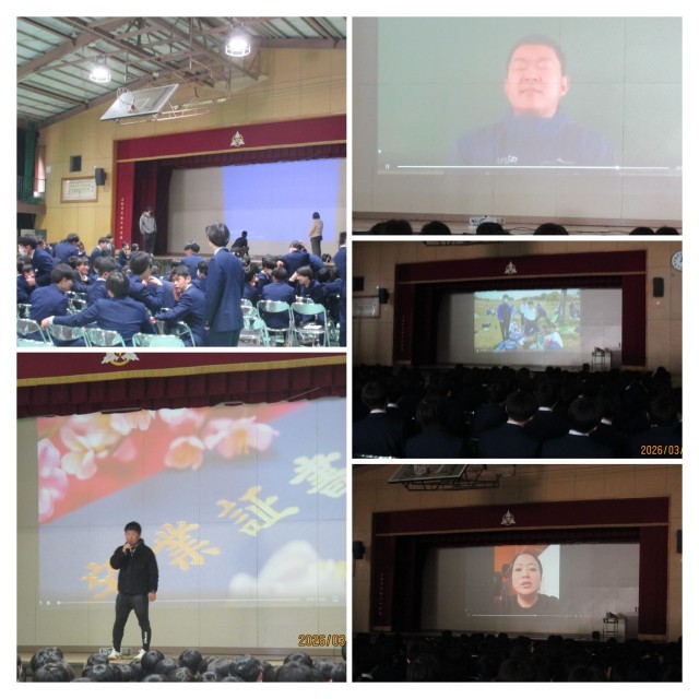 久保先生を中心に学年の先生方が『46期生の想い出』動画を作ってくださり、学年全員で見ました。転勤で異動された元学年の先生方からのビデオメッセージもありました。