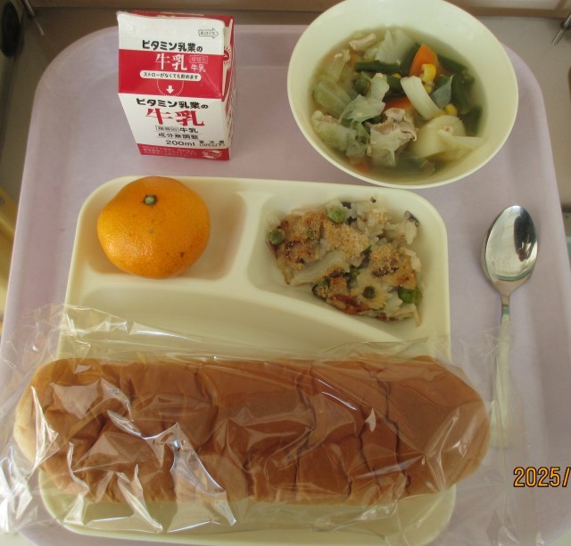 12月11日(木)本日の献立きのこのドリア鶏肉と野菜のスープ煮みかん黒糖パン牛乳
