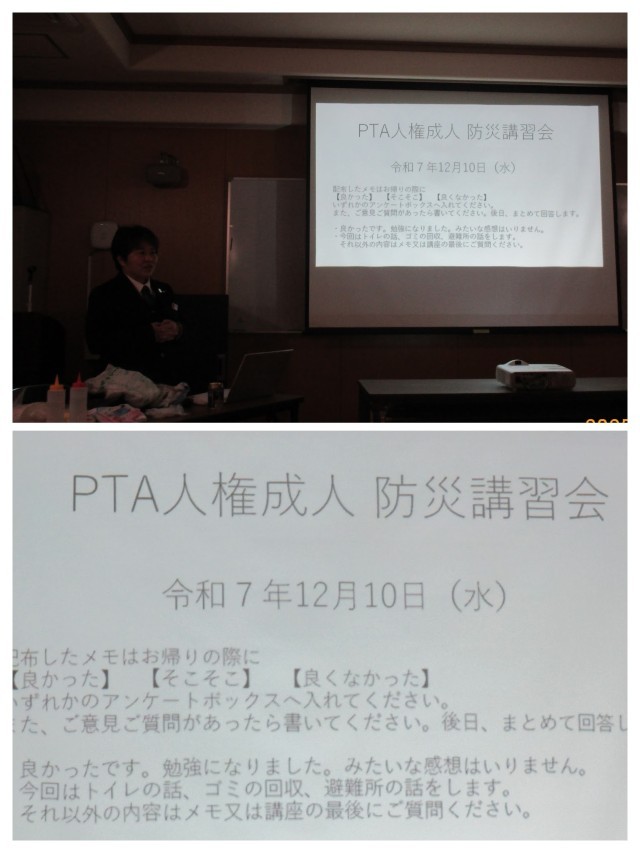 12月10日(水)『PTA人権成人 防災講習会』を多目的室にて実施しました。本校...