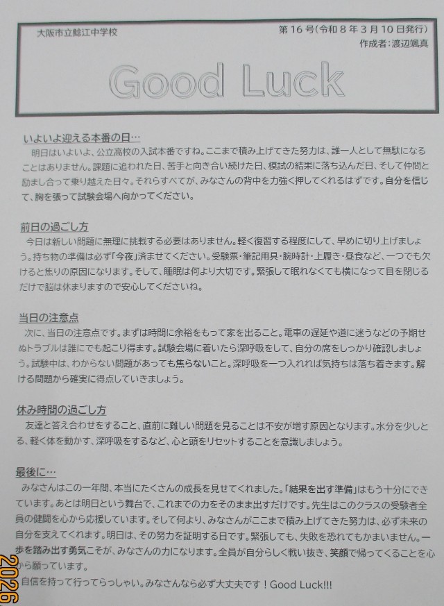 Good Luck (3年5組学級通信 第16号、3月10日発行)いよいよ迎える...