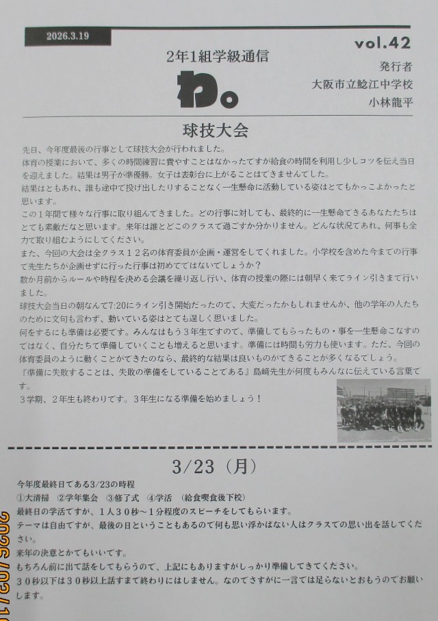 わ。 Vol.42(2年1組学級通信、3月19日発行)球技大会 先日、今年度最後...