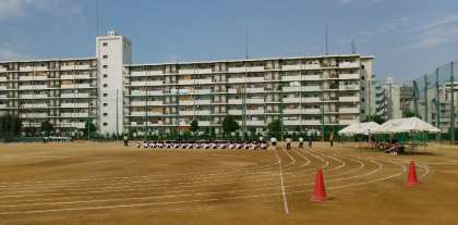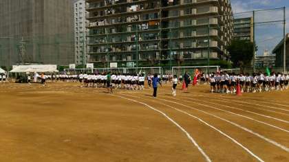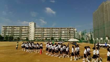 まず、入退場を説明を聞いてから、実際に練習しています。