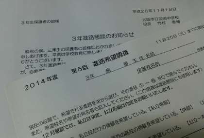 3年生のみなさんに「12月進路懇談」と「進路希望調査」の2枚のプリントを配布いたします。先週懇談が終わったばかりですが、12月進路懇談に向けて準備にはいっております。
