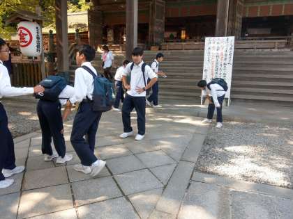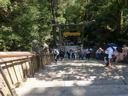 本殿に続々と到着しています。「しんどい」と汗だくで登ってきました。