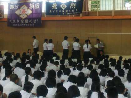 今、始業式をしていますが、部活動等の表彰がたくさんありました。みんな、よくがんばりました。これからもしっかりとね!!