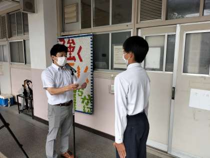 本日は後期生徒会の認証式を行いました。また、水泳部と剣道部に賞状の伝達も行いました。