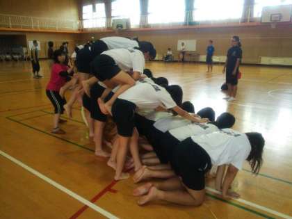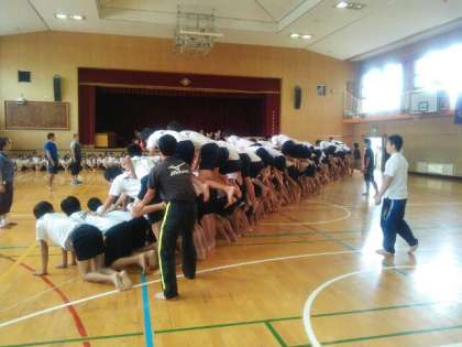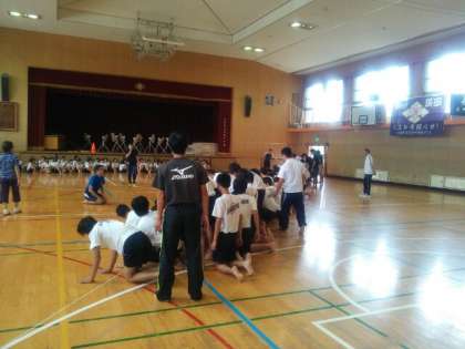 体育祭に向けて、各学年で「学年種目」(学年で一つのことをする)の練習を実施しています。はじめは、なかなかそろわないですが、気持ちを一つに、「やろう!」と思ってがんばってくれています。今日は天候が悪いので体育館で練習をしています。