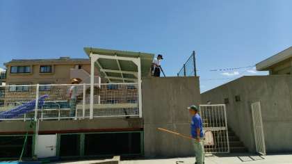 プール掃除のための準備を管理作業員の方と一緒に作業しています ↓