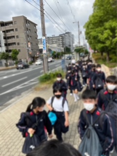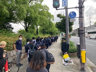 出発式を終え、体育館からバスのところに移動し、当初の予定より遅れましたが、無事に出発しました。