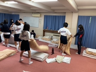 6:00に起床し、寝具の片付けをしています。