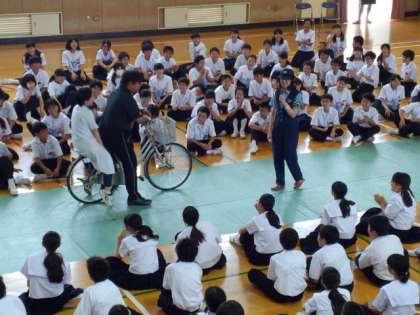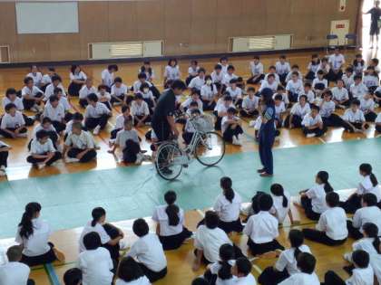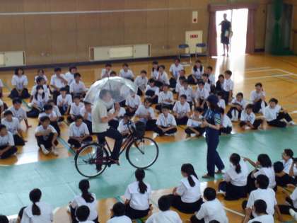 鶴見警察署から来ていただき、自転車等で実際によくない乗り方をして、何がいけないかのお話をしていただきました。
