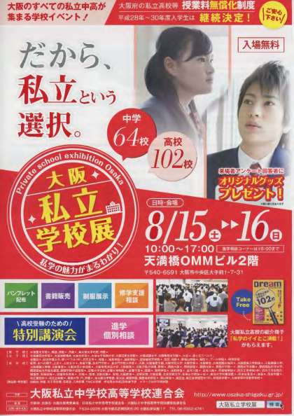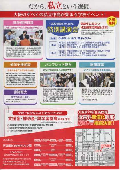 毎年、夏休み中に開催されている、「大阪私立学校展」(大阪私立中学校高等学校連合会主催)のご案内が届きました。