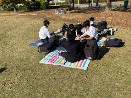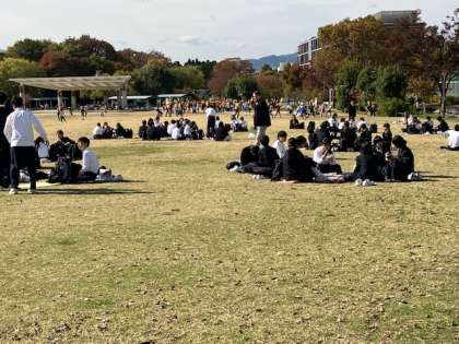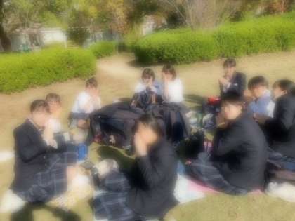 1年生は鉄道博物館での見学を終え、芝生広場で昼食中です。