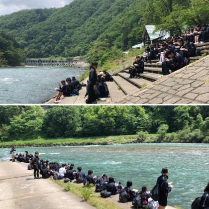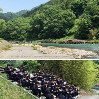 ラフティングのスタート地点の川の駅さざなみで昼食をとっています。