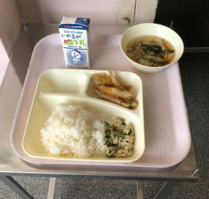 本日のメニュー ・いわしてんぷら ・五目汁 ・とりなっ葉いため ・ごはん ・牛乳