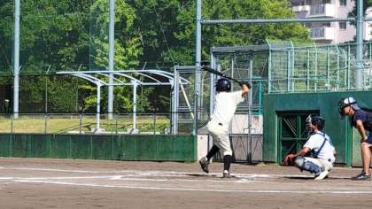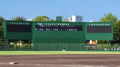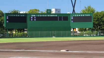高校野球等にも使われる球場で、電光掲示板やアナウンス付きで試合をすることができました。