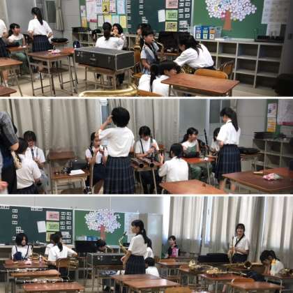 吹奏楽部では、中学生が優しく丁寧に小学生に教えていました。