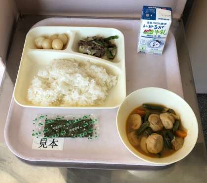 今日の給食には、「一口がんもとさといものみそ煮」と「みたらしだんご」が出ます。