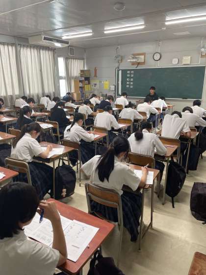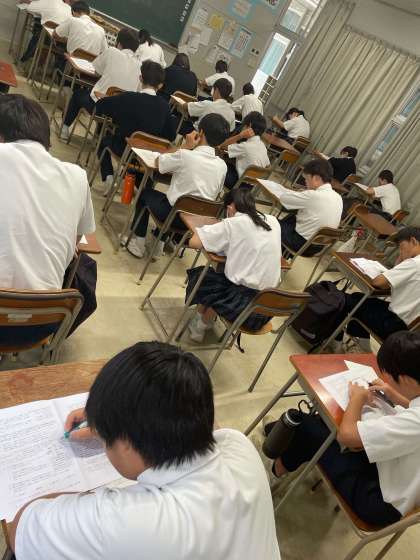 本日は3年生の第3回実力テストの日です。1限 国語 2限 理科 3限 社会 4限 数学 5限 英語 の時間割です。テストの得点は、将来の進路選択のための大切な資料になります。実力が発揮できるよう、健闘を祈ります。