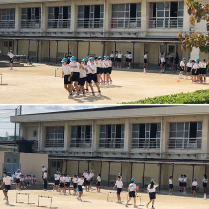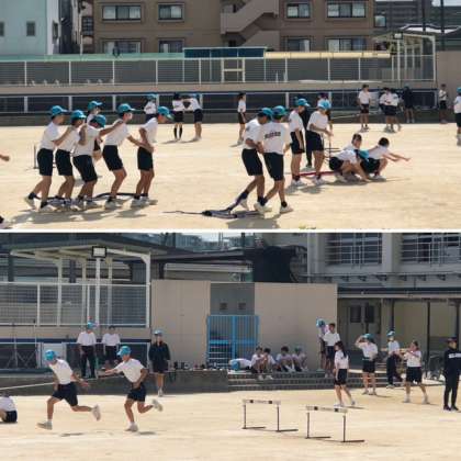 今日は、小学生が運動会の練習のため運動場を使用しているので、中庭で体育大会の出場種目の練習に取り組んでいました。