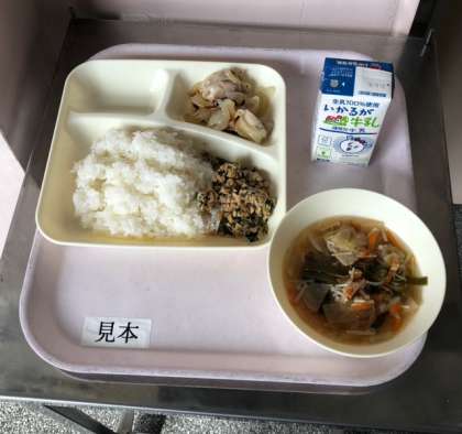 今日の給食は、沖縄料理のソーキ汁です。給食では、豚ばら肉、大根、切りこんぶなどを使用しています。