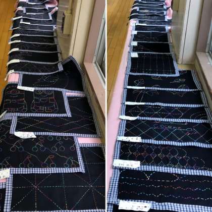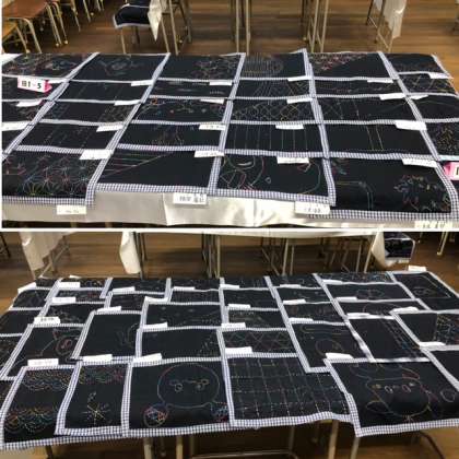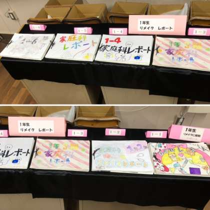 上:1年生「リメイクレポート」いらなくなった衣料品を、工夫して使えるものに変身させました。