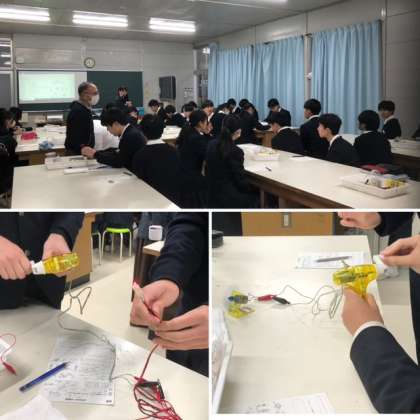 理科は、エネルギーの変換に関する実験を6つ行いました。そのあと、それぞれの実験で、どのようにエネルギーが変換されたのかをグループでまとめていきました。(写真上)