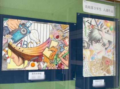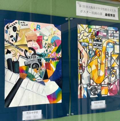 玄関の掲示板には、3年美術部の入選作品(大阪市総合文化祭ポスター原画の部)が4点展示されています。最優秀賞作品もあり、力作ばかりです。