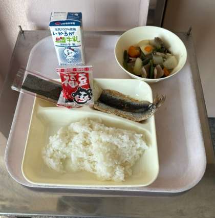 給食では、節分の行事献立として「いわしのしょうがじょうゆかけ」と「いり大豆」が出ます。