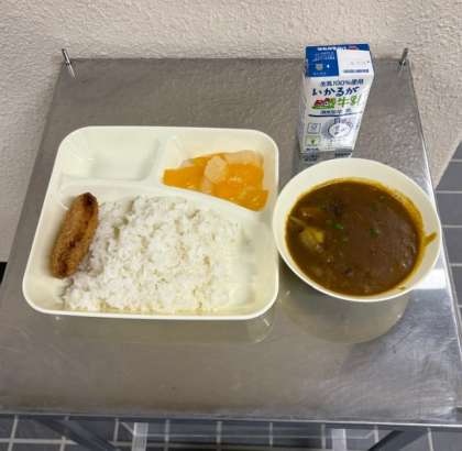 カツカレーライスは、一口トンカツを人気のカレーライスにそえることでお祝いらしさを出しています。(小麦粉の代わりに米粉を使用したルウを使っているので、小麦アレルギーのある人も食べることができます。)