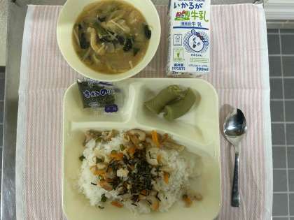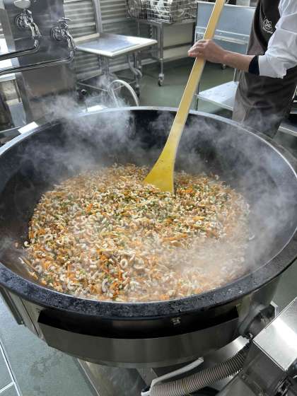 今日のかやくご飯は、鶏肉・ちくわ・にんじん・三度豆を使った具を給食室で作っています。