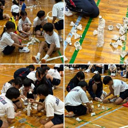 バドミントンのシャトルを積み上げ、積み上げられた数を競います。
