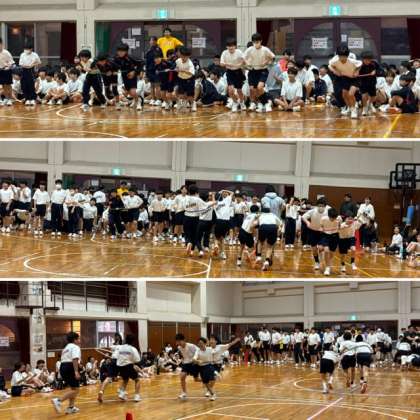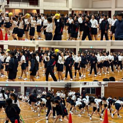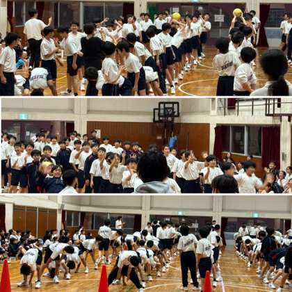 行きは頭の上でボールを運び、帰りは足の間を通してボールを運びます。