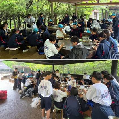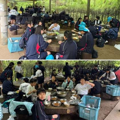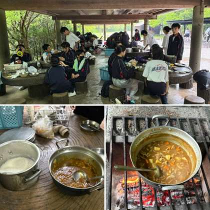 全てのクラスでカレーが出来上がり、炊事班ごとに昼食をとっていまづす。