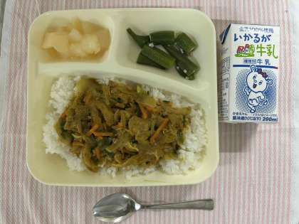 和風カレー丼は、豚肉、たまねぎ、にんじん、青ねぎが使われています。