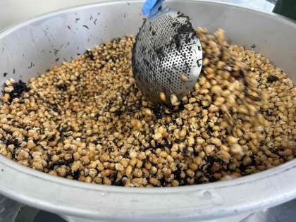 でんぷんをまぶし、油で揚げた大豆にひじきを使ったタレをかけて和えます。