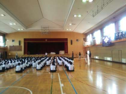 本日5時間目、1年生が体育館で「一泊移住」に向けた取り組みをしています。