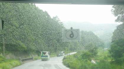 最終8組がゴンドラを降り、ラフティングへバスが出発しました (小雨がふりだしました)