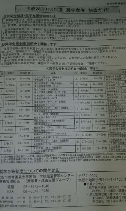 「平成28(2016)年度奨学金等制度ガイド」のプリントが、大阪市教育委員会から届きましたので、3年生のみなさんに配布いたします。