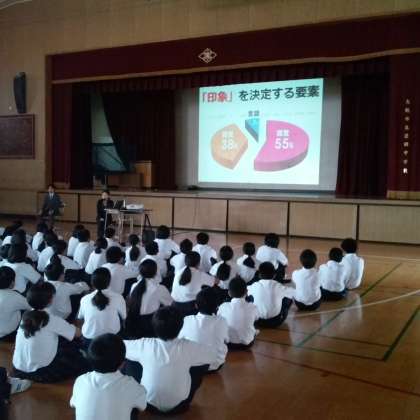6時間目に体育館で、学生服メーカーの方を講師にお招きして「制服着こなし講座」を実施しました。着こなしと第一印象の話や制服の持つさまざまな意味など、とてもわかりやすく説明してもらいました。意味が分かったことで、1年生のみなさんも明日からさらに着こなしが良くなることでしょう。これから気温も高くなり、服装もゆるみがちですが、せめて学習にのぞむときぐらいは、気持ちも服装もピリッと引きしめて欲しいものです。
