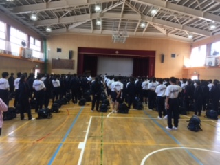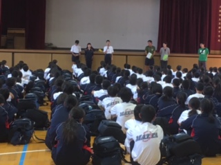 15:00ごろにバスが学校に到着し、体育館で終了式を行いました。みんな疲れた顔の中にも、満足感が見られるようすでした。教頭先生からは、多くの取り組みで一つのことを気持ちを一つにして行うことができました、というお話をしていただきました。