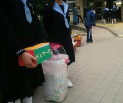 毎朝、生徒会の代表が正門で「ベルマーク」と「ペットボトルキャップ」の回収をしています。ベルマークはいろんな備品、ペットボトルキャップはワクチンの寄付などにあてられるそうです。