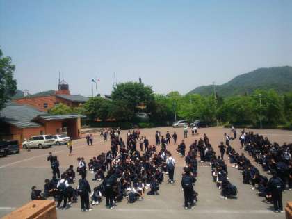 これから学級写真を撮った後、昼食だよ〜 広場に全員集合〜