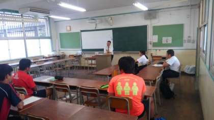 本日の授業風景。ラグビー部と2年生男子、1年生女子1名が参加してくれました。ネイティブな英語を聞くだけでも勉強になりますよ。