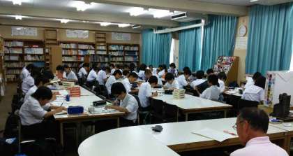 参加申し込みした1年生は50名ほどです。みんな、期末テストに向けての学習をしています。( 部屋が満員に近いです、すごい! )