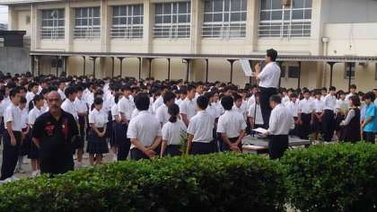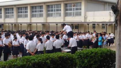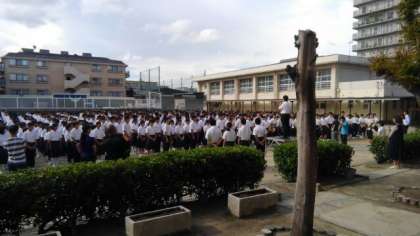 本来、月曜日に行われる全校集会でしたが、昨日、雨天のため本日に順延されました。しばらくなかったさわやかな朝を迎えることができました。夏休み中の部活動の成果で、剣道部、柔道部、演劇部が表彰され、8日(土)に行われたワールドトークについても表彰されました。