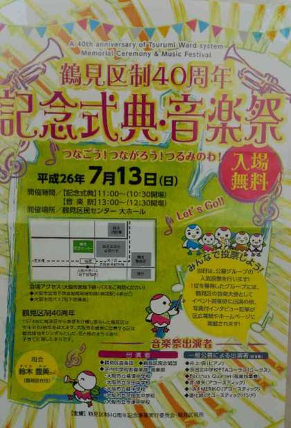 鶴見区制40周年記念式典・音楽祭が7/13(日)に区民センターで開催されます。本校をはじめ鶴見区の中学校の吹奏楽部」が出演します。ぜひとも、ご覧ください。