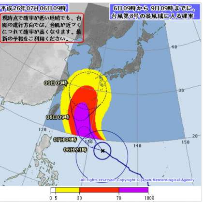 下の図は、「国土交通省気象庁のHP」から7/6の9時の「暴風圏に入る確率」の情報です