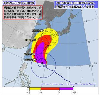 下の図は、「国土交通省気象庁のHP」から7/7の9時の「暴風圏に入る確率」の情報です。 これからも台風情報にはご注意ください。
