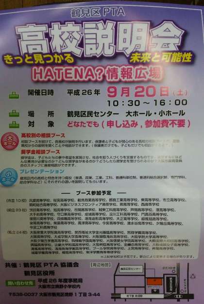 夏休みに開催された、公立・私立の説明会は府内すべての高校が参加していましたが、今回は「鶴見区PTA協議会・鶴見区役所共催」ということで、この地域からよくいく高校を中心に来ていただきます。